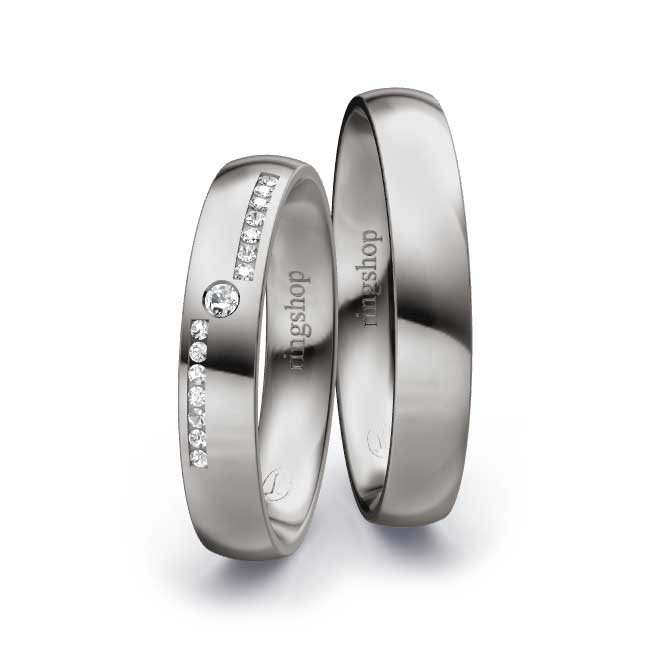 Palladium: Das mit Platin verwandte Metall Palladium erhält mit einem Feingehalt von 950/- eine besonders helle und strahlende Oberfläche. Mit einem Feingehalt von 500/- ist es deutlich dunkler wie etwa Graugold.