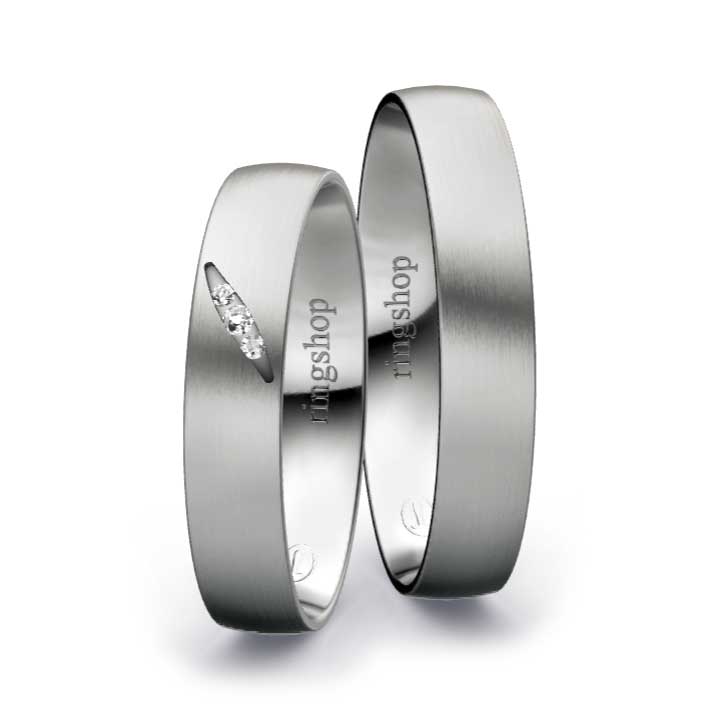 Palladium: Das mit Platin verwandte Metall Palladium erhält mit einem Feingehalt von 950/- eine besonders helle und strahlende Oberfläche. Mit einem Feingehalt von 500/- ist es deutlich dunkler wie etwa Graugold.