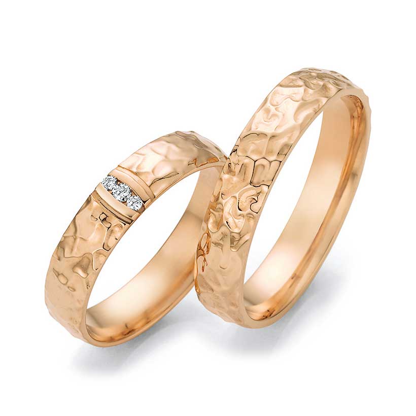 Rotgold: Es handelt sich um eine Legierung aus Feingold, Kupfer und Silber mit Goldanteilen zwischen 333/- und 750/-. Der etwas größere Kupferanteil sorgt für die namensgebende „rote“ Färbung und Härte des Materials. Der elegante und gleichermaßen zeitlose Farbton ist Kupfer ähnlich.